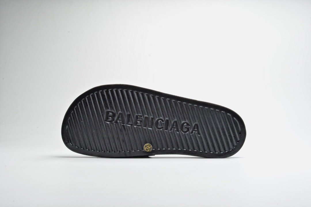 The Balenciaga Logo Pool Slides 2020SS feature a sleek design with a prominent logo and durable synthetic strap. Includes a molded footbed for comfort and a lightweight rubber outsole for flexibility. Ideal for casual wear and poolside lounging.