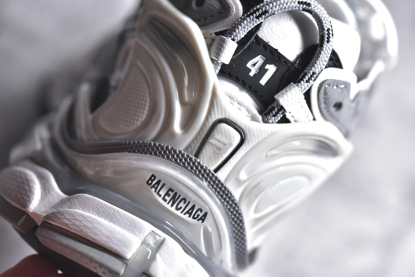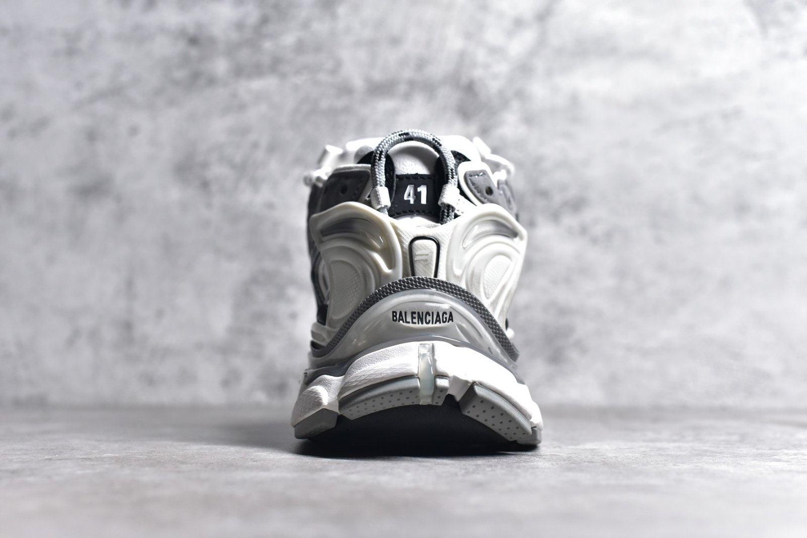 The exaggerated. multi-component sole provides superior cushioning and support. ideal for a range of activities from casual outings to more intense wear. A padded collar and tongue enhance comfort. while the lace-up closure ensures a secure fit. Reflective accents improve visibility in low-light conditions. adding a practical touch to the stylish design. Subtle Balenciaga branding on the side and tongue completes the modern. sporty look. Perfect for those who appreciate a combination of performance and contemporary style. the Balenciaga Runner Sneaker in Grey/White/Black is a versatile and fashionable addition to any sneaker collection.