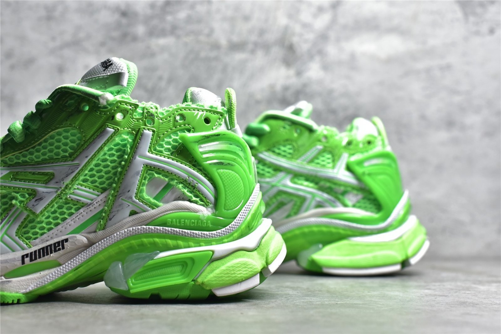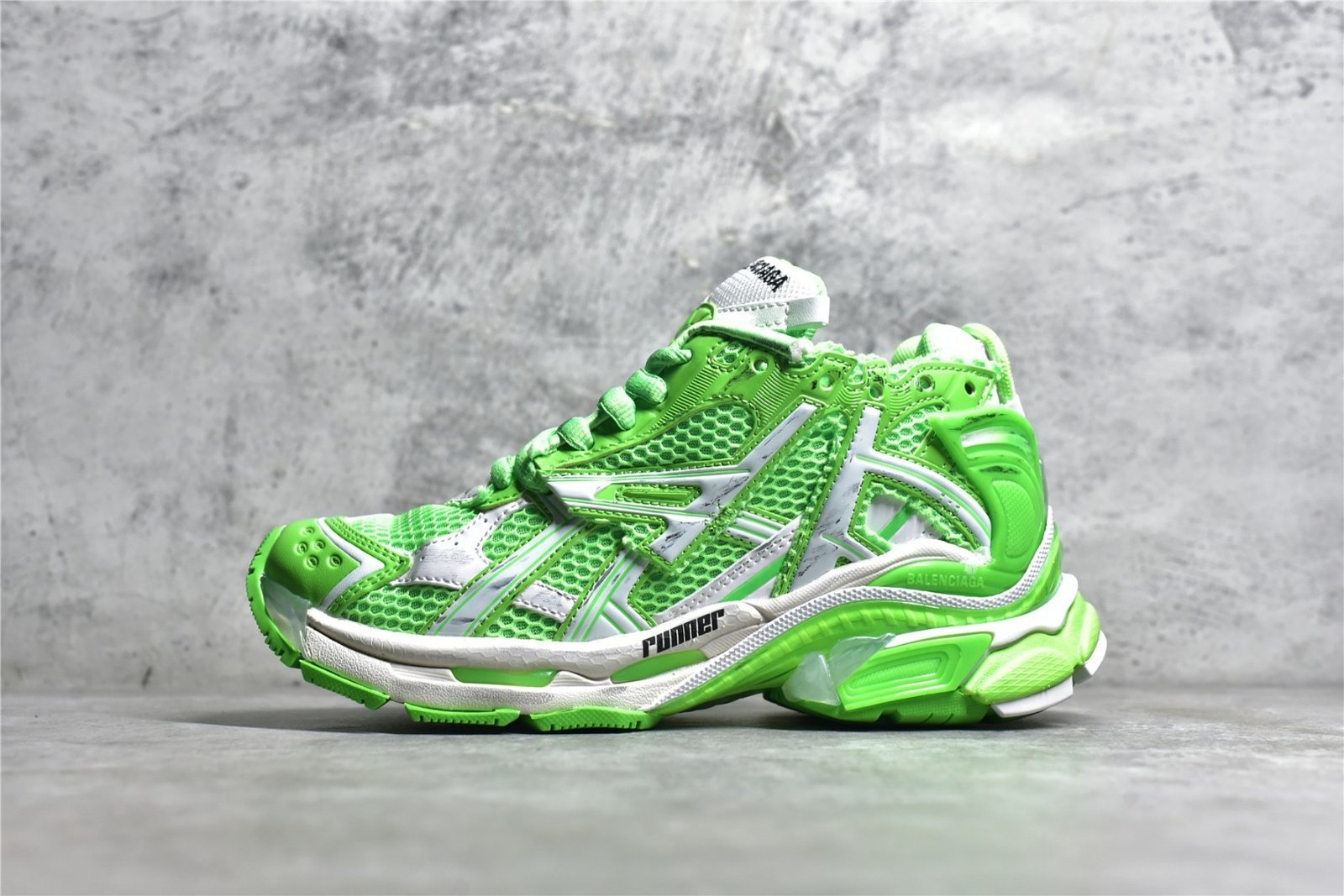 The Balenciaga Runner Sneakers in Fluo Green feature a vibrant colorway with a mix of mesh. leather. and synthetic materials. and a chunky sole for comfort and support. Ideal for those who want bold. innovative style in their footwear.
