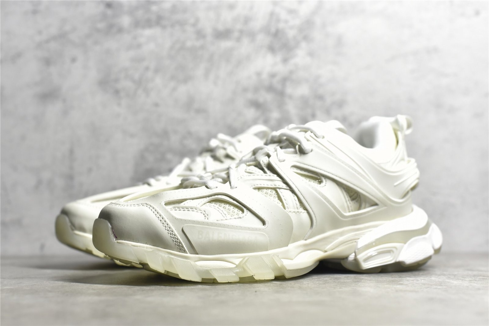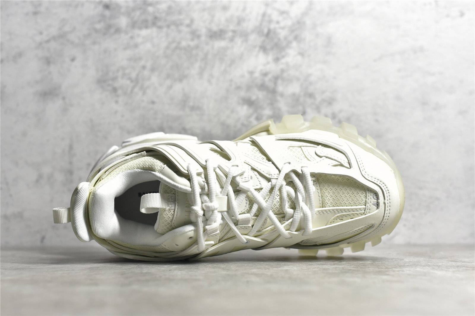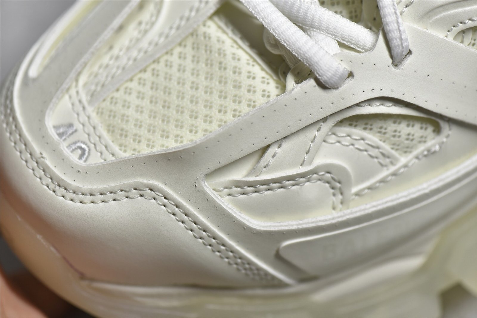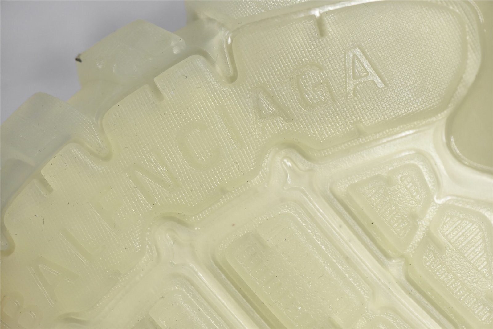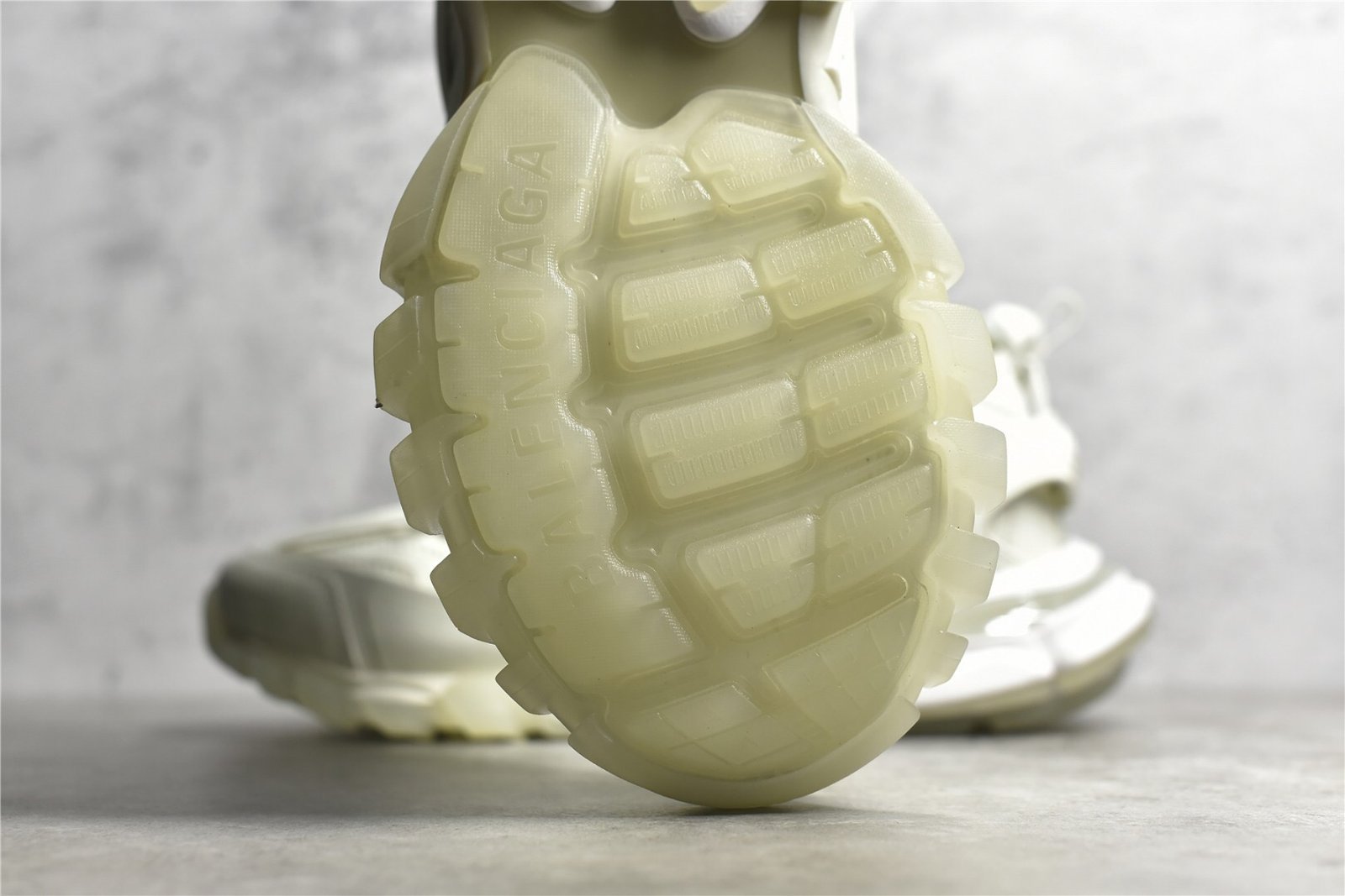 The Balenciaga Track Clear Sole Sneaker Cream GID combines cream mesh with nylon for a stylish look. Features layered construction. padded collar. glow-in-the-dark sole unit. and durable rubber outsole. Ideal for sneaker enthusiasts.