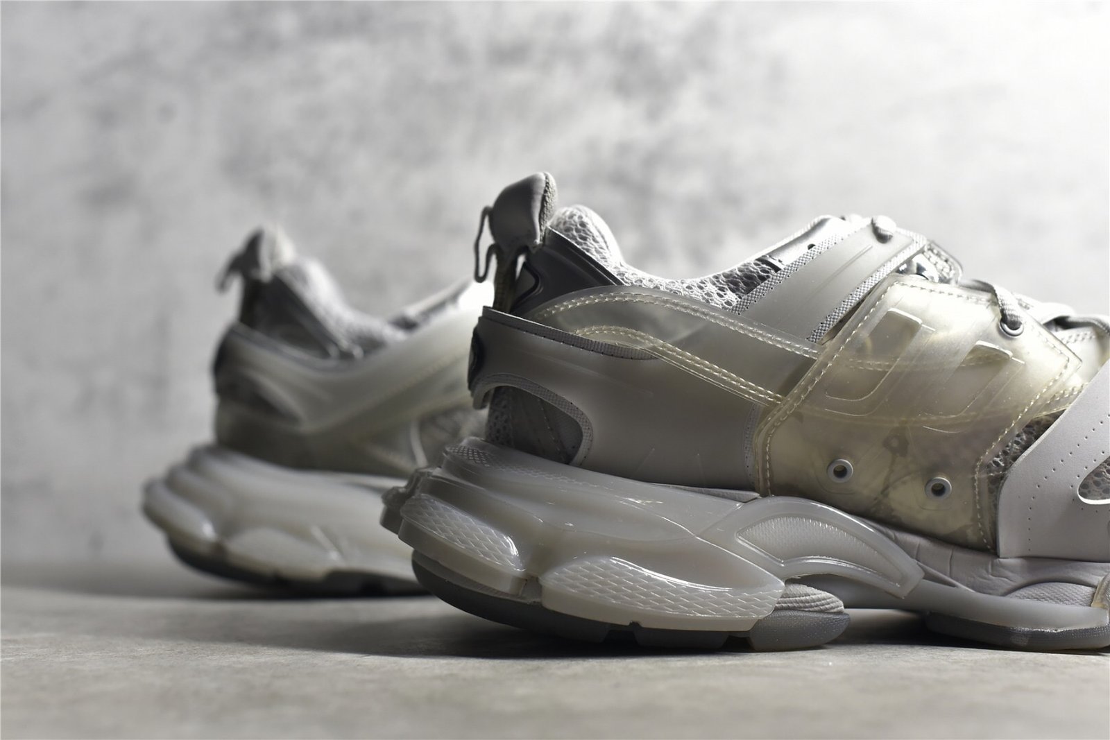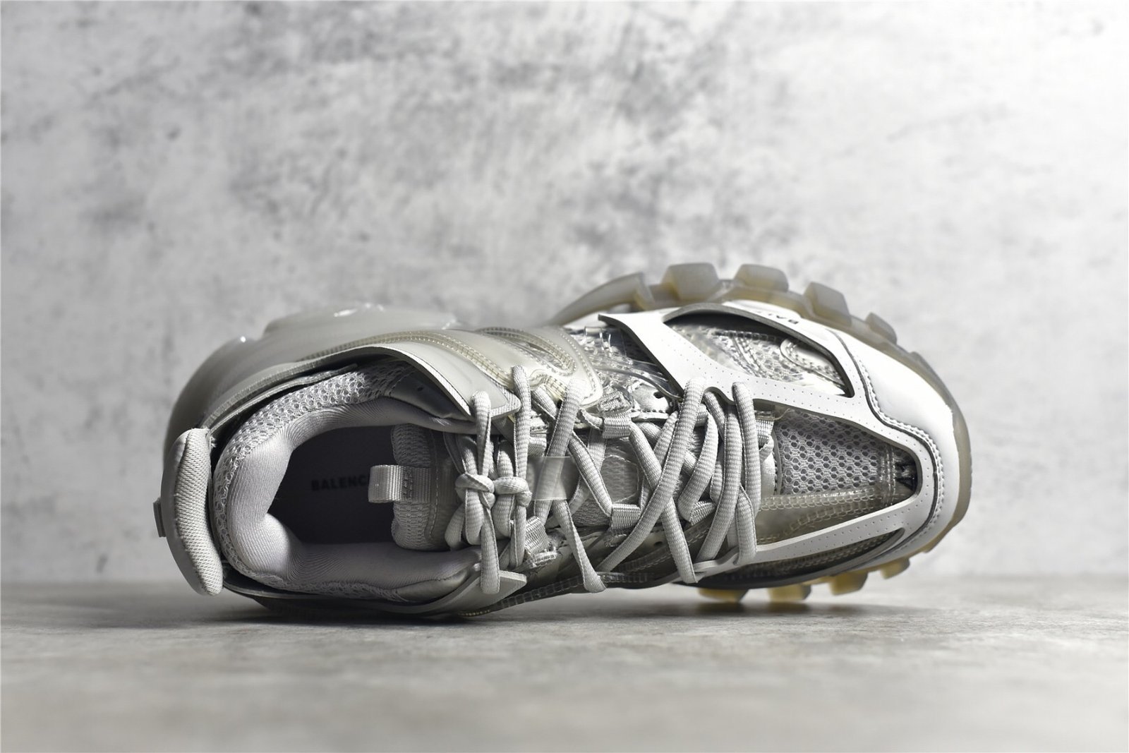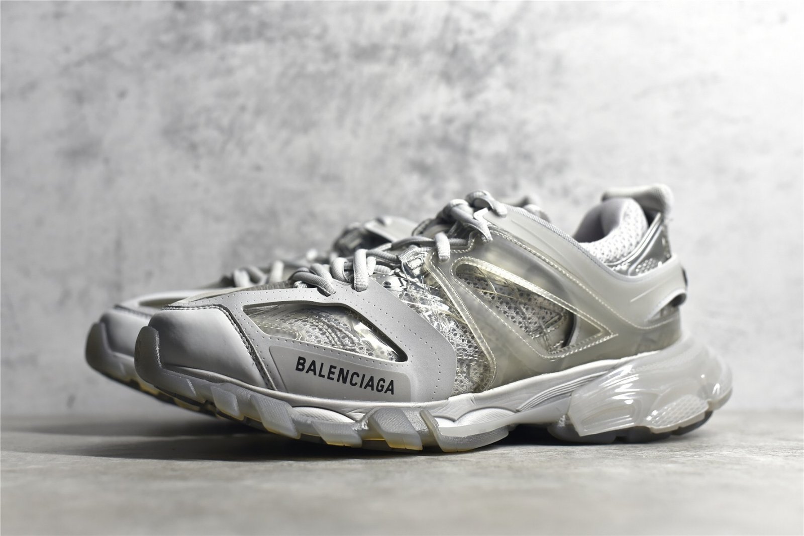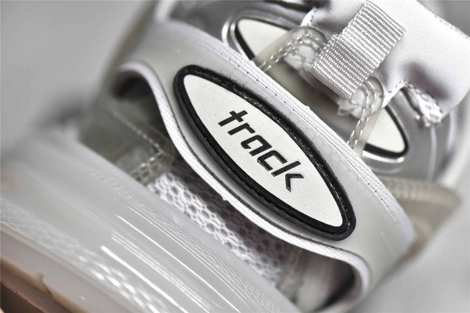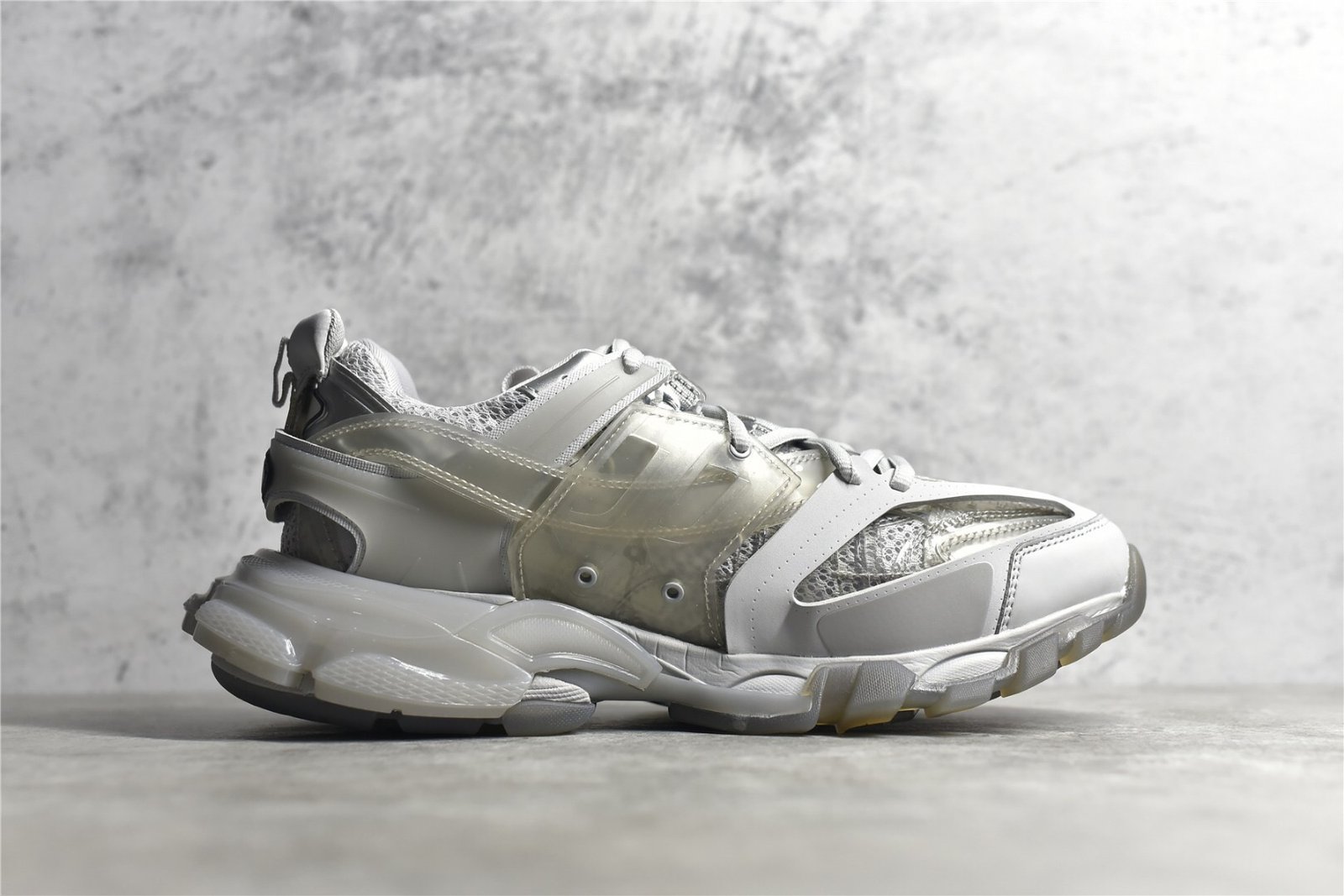 The Balenciaga Track Clear Sole Sneaker Gray combines gray mesh with nylon for a sleek look. Features a layered construction. padded collar. clear sole unit. and durable rubber outsole. Ideal for sneaker enthusiasts.