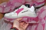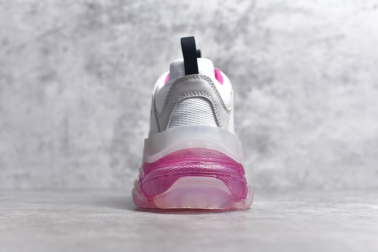 The Balenciaga Triple S Clear Sole WhitePink combines white and pink hues with a clear sole for a stylish. modern look. Features mesh and leather upper. clear sole. padded collar. and chunky rubber sole. Ideal for fashion-forward sneaker enthusiasts.