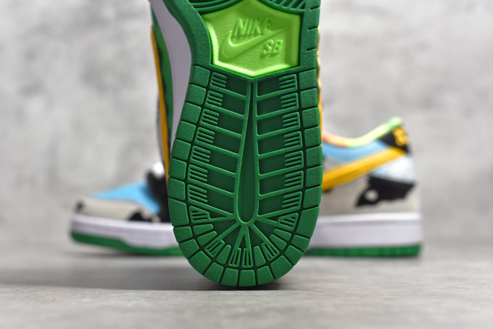 • Design Elements: Features a playful design with sky blue and green hues. cow print overlays. and colorful accents reminiscent of the ice cream pint packaging. Ben & Jerry’s branding appears on the tongue tag. while Nike SB branding is on the heel and insoles.