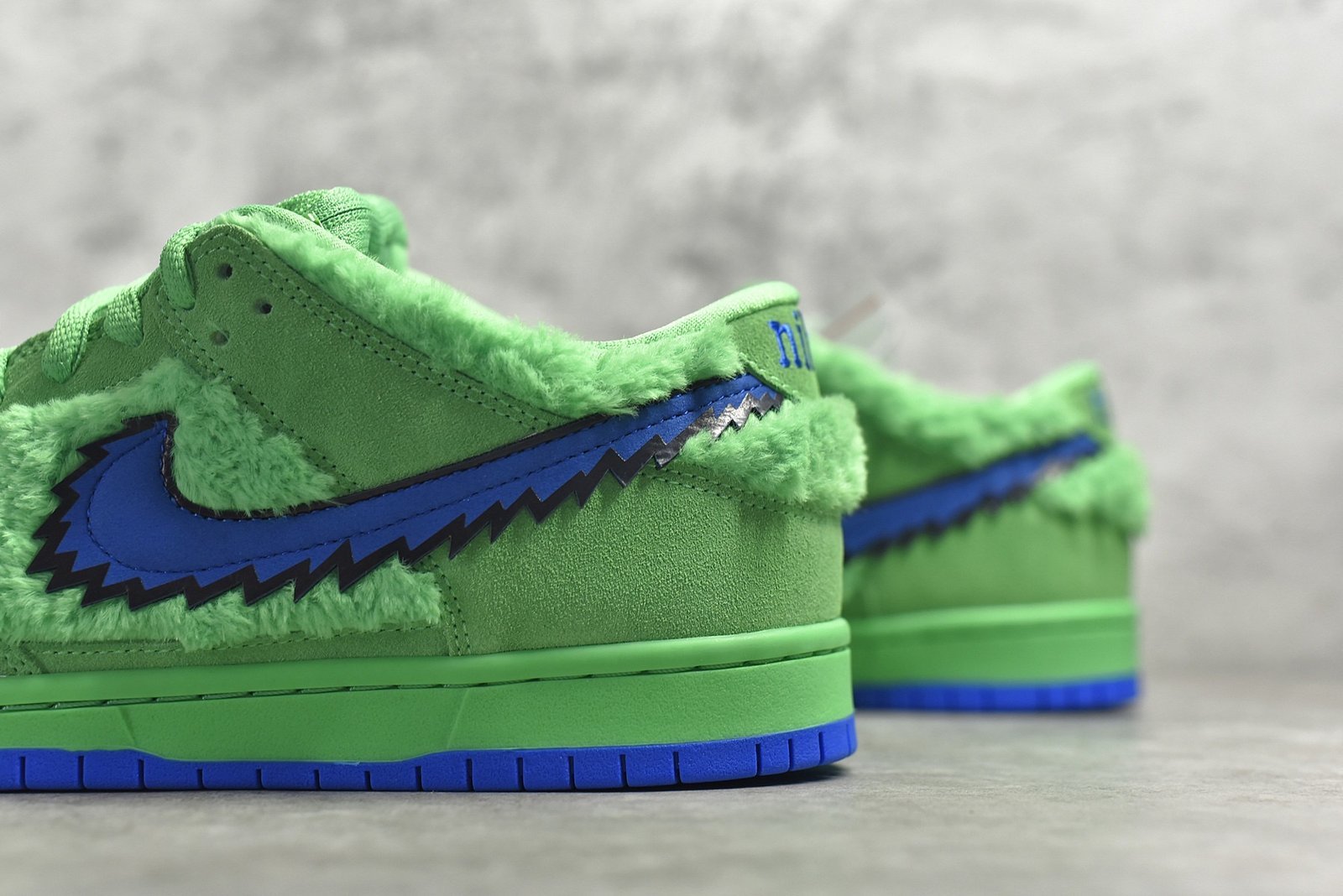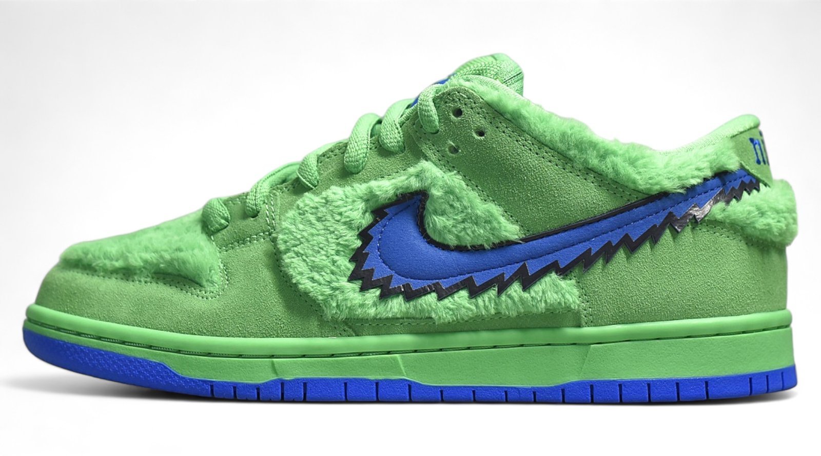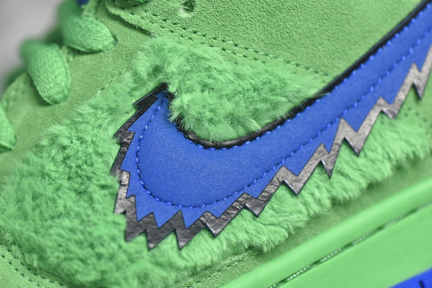 The SB Dunk Low Grateful Dead Bears Green features a vibrant green upper with faux fur panels and suede overlays. This playful sneaker includes a jagged Swoosh. hidden stash pocket. padded tongue and collar. Zoom Air cushioning. and a durable rubber outsole for comfort and performance.