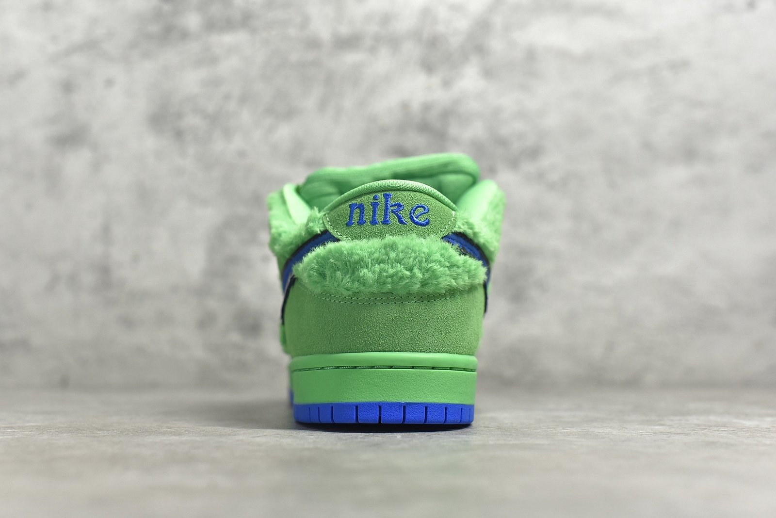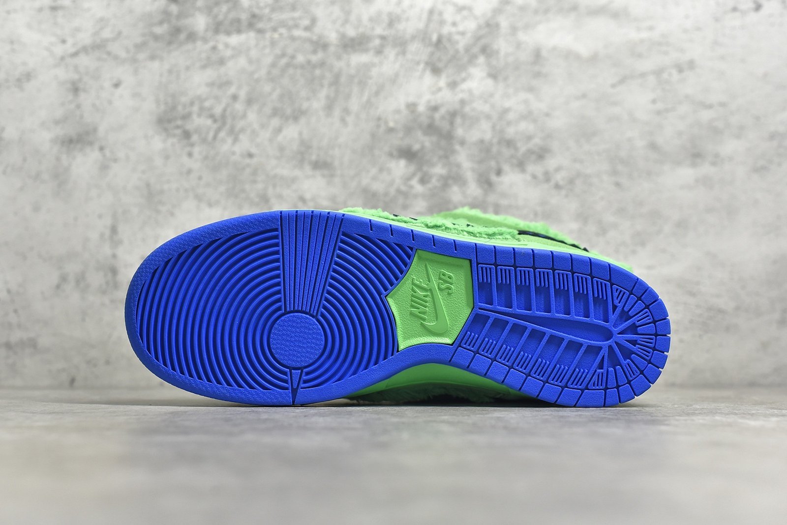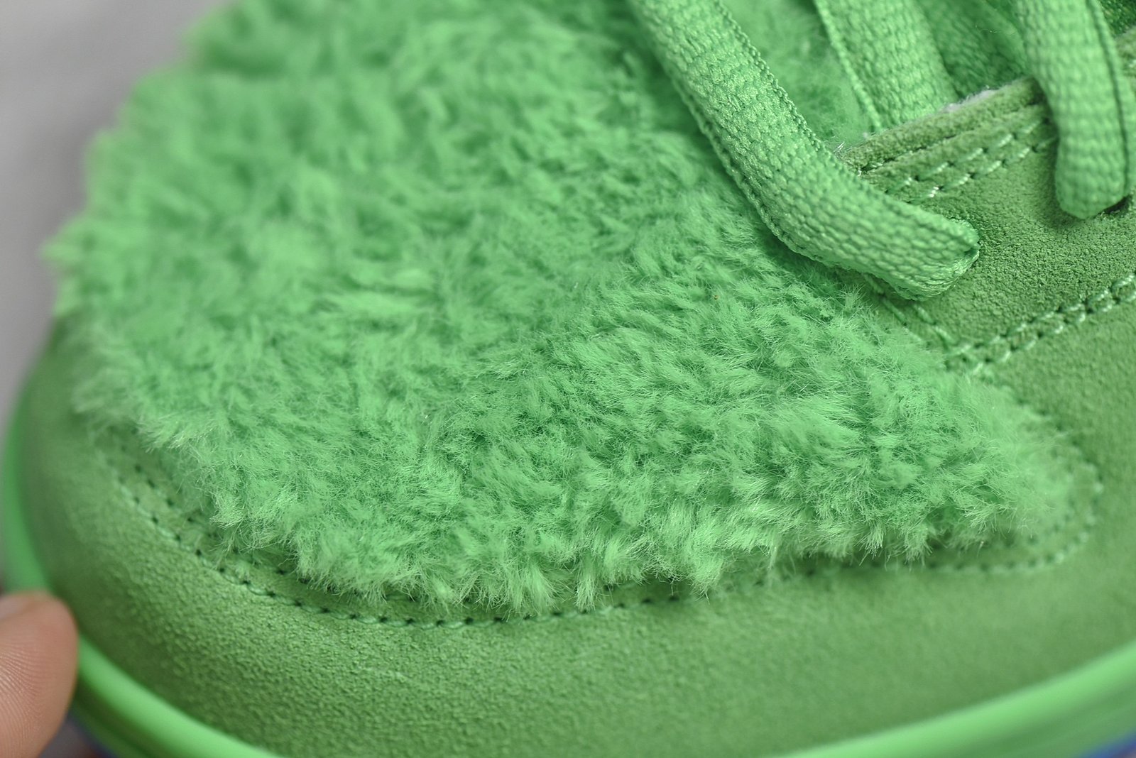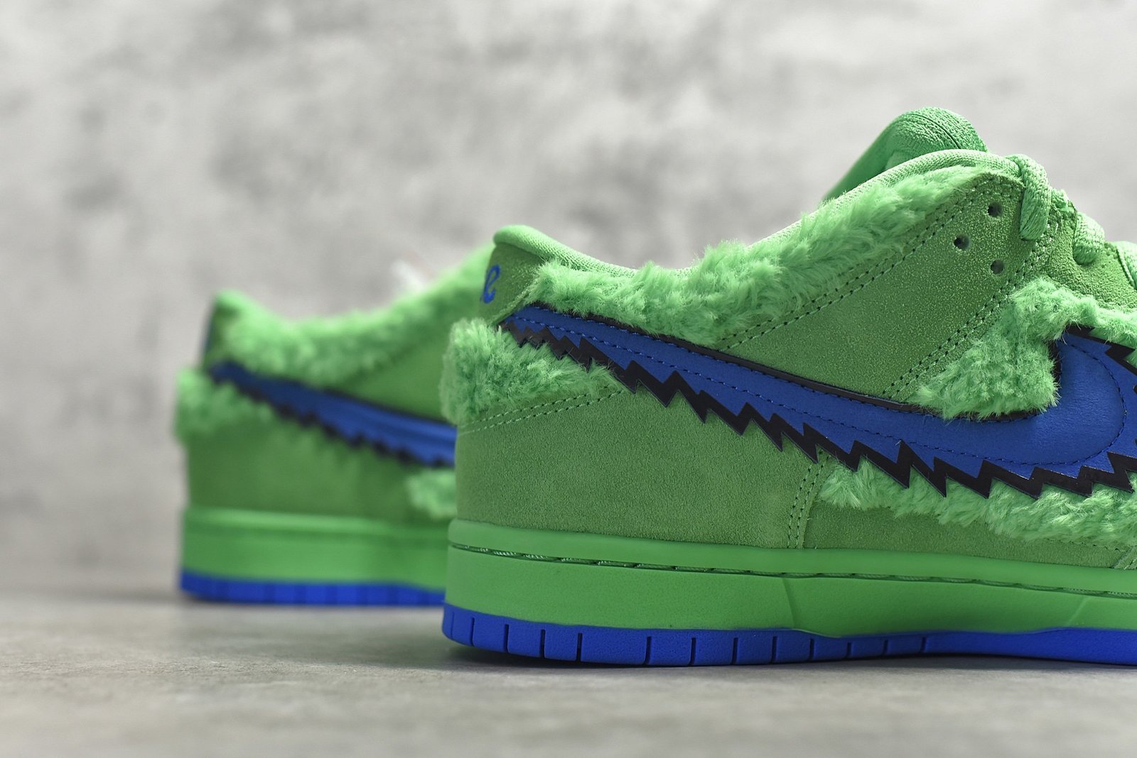 The SB Dunk Low Grateful Dead Bears Green features a vibrant green upper with faux fur panels and suede overlays. This playful sneaker includes a jagged Swoosh. hidden stash pocket. padded tongue and collar. Zoom Air cushioning. and a durable rubber outsole for comfort and performance.