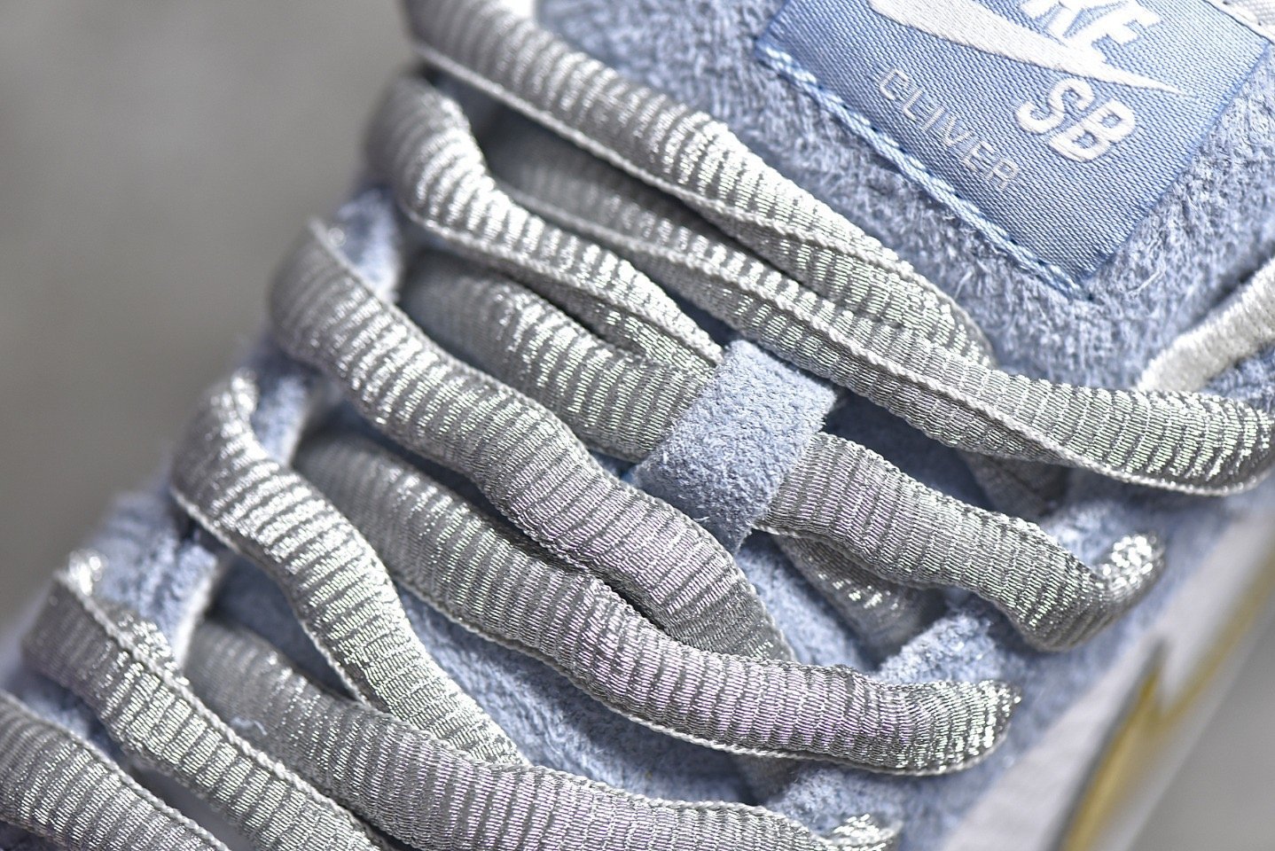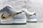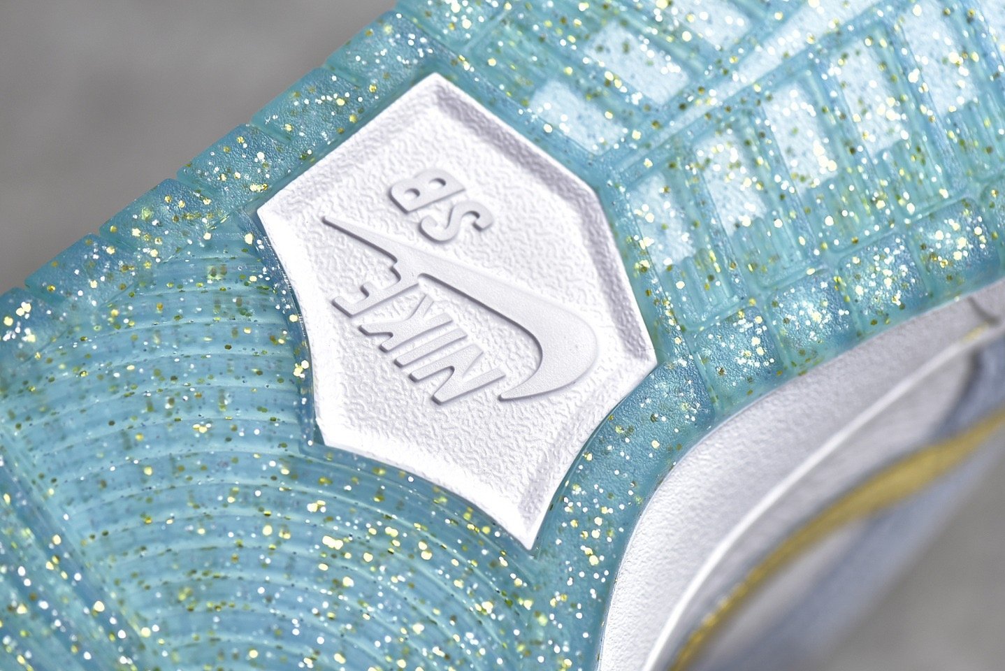 The SB Dunk Low Sean Cliver DC9936-100 features a white. blue. and metallic gold colorway with intricate design elements. This sneaker includes special graphics on the insoles. glittery gold accents. and an icy blue outsole. It offers a padded tongue and collar. Zoom Air cushioning. and a durable rubber outsole for comfort and performance.