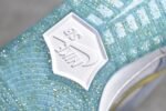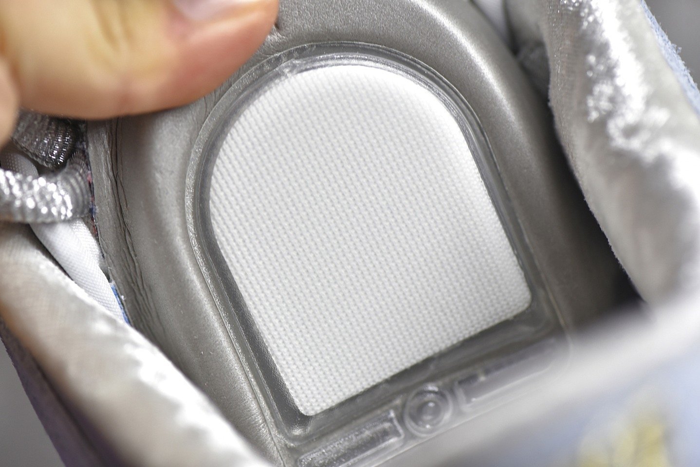 • Design Elements: This sneaker features a white. blue. and metallic gold colorway with intricate details. It includes special graphics on the insoles and glittery gold accents. The icy blue outsole adds a unique touch. making it stand out.