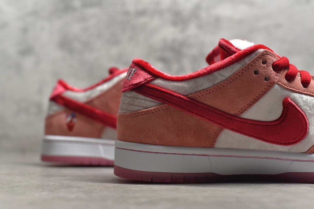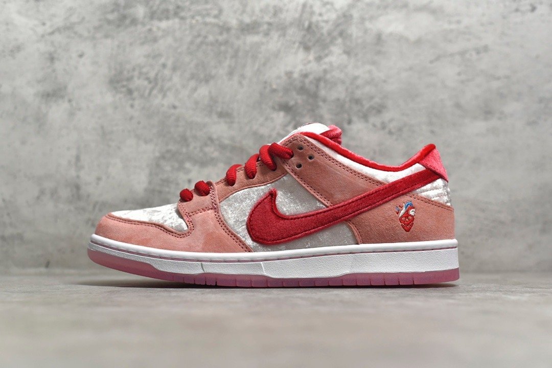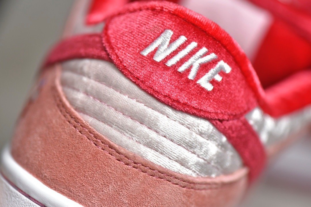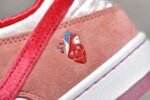 The SB Dunk Low StrangeLove Skateboards CT2552-800 features a vibrant mix of pink. red. and white. premium suede and velvet materials. breathable construction. responsive Zoom Air cushioning. and a durable rubber outsole. Ideal for skateboarders and sneaker enthusiasts looking for a stylish and unique shoe with a standout design.